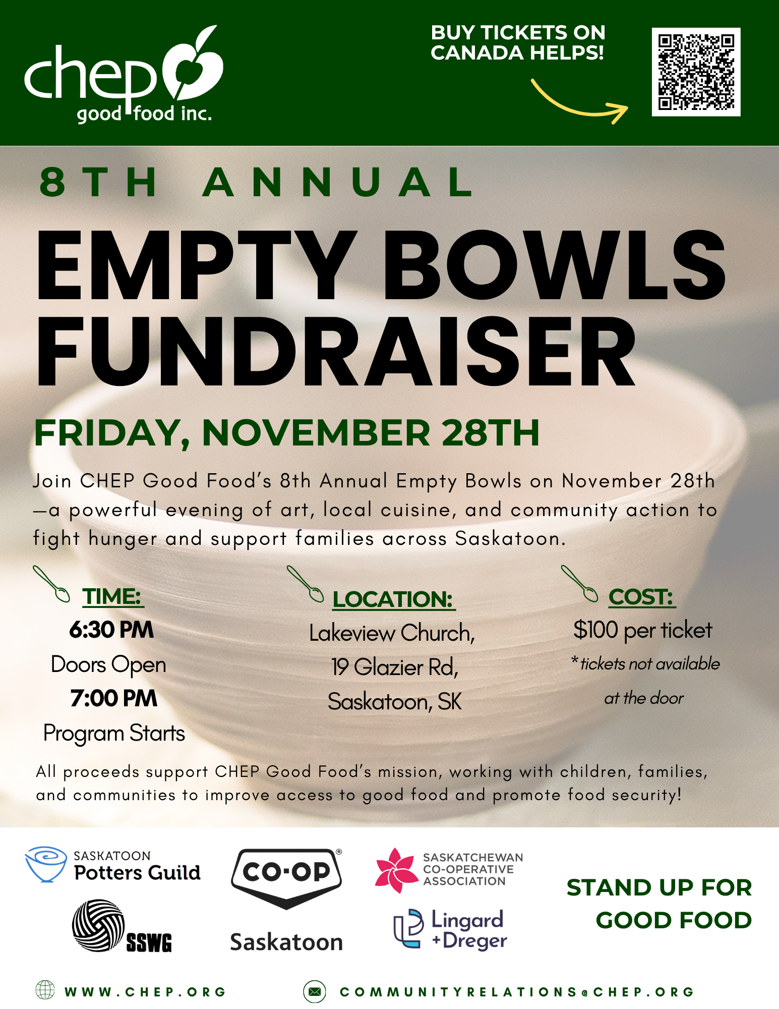 Last year, your support helped us raise over $14,000 for our food security programs, and we can’t wait to continue this momentum together. Every ticket purchased supports CHEP Good Food’s mission—working with children, families, and communities to improve access to good food and promote food security across Saskatoon.
